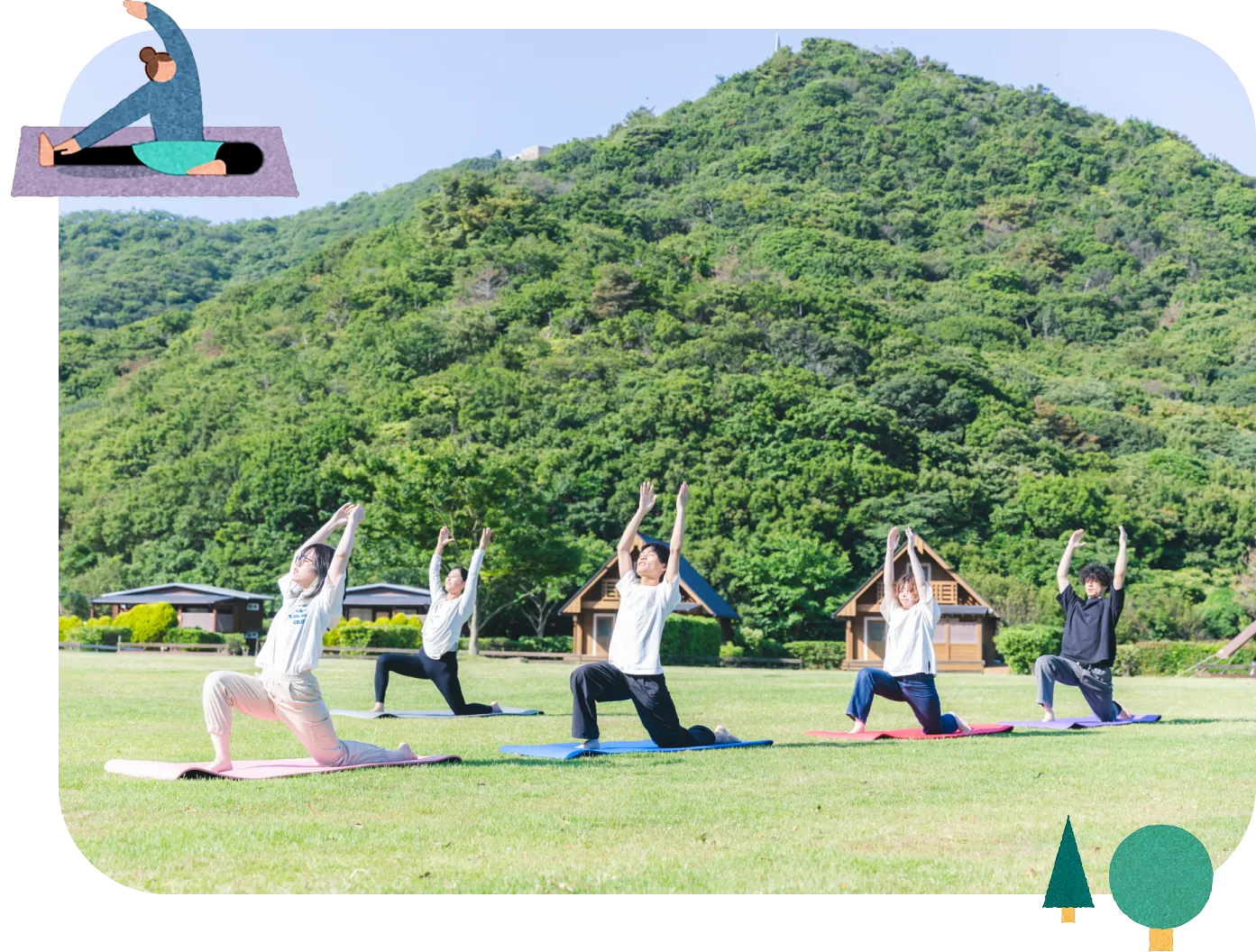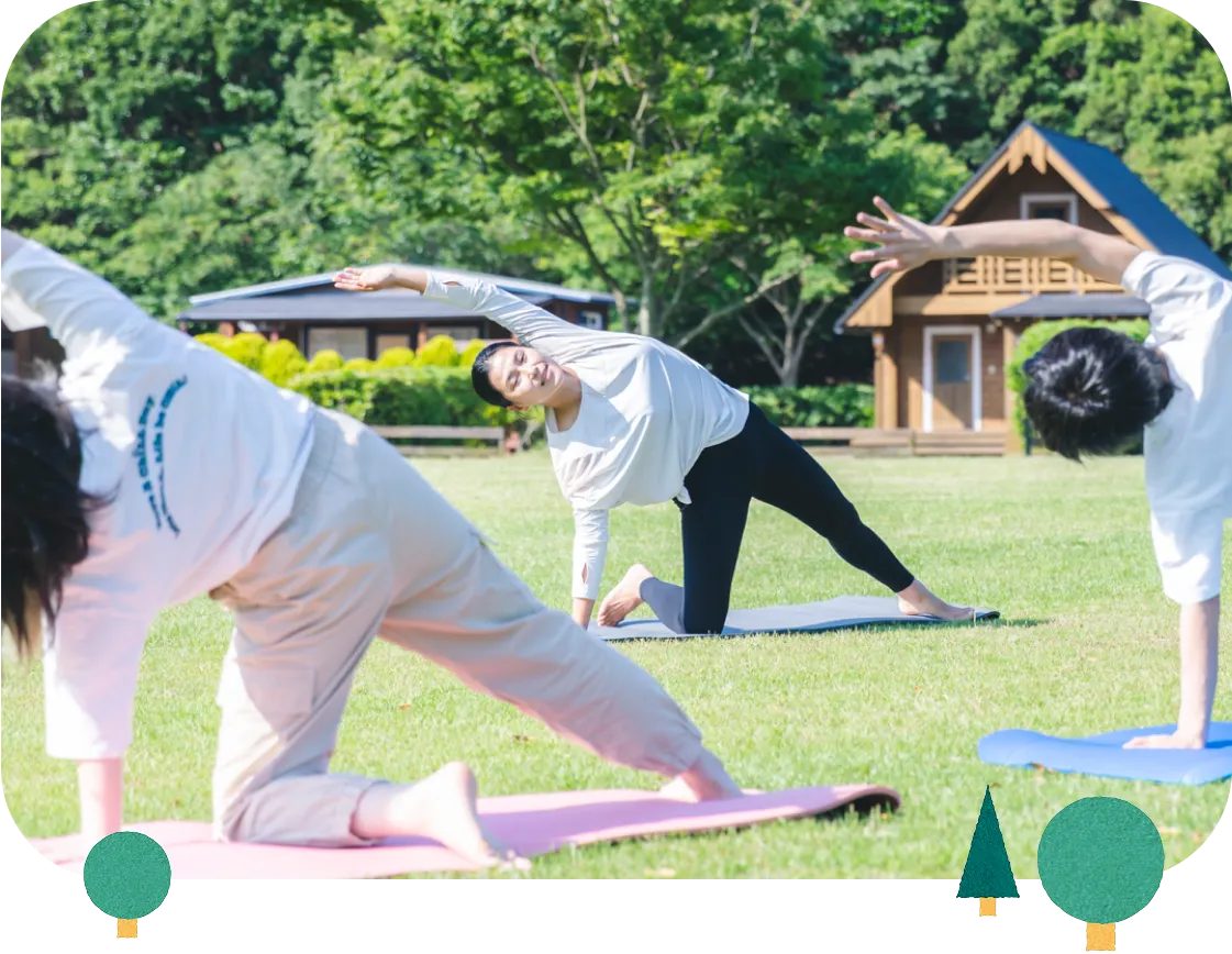 鳥のさえずり、風の音、芝生の感触…五感を使って自然を感じながら行う朝ヨガは、開放感や非日常の癒しがたっぷり。