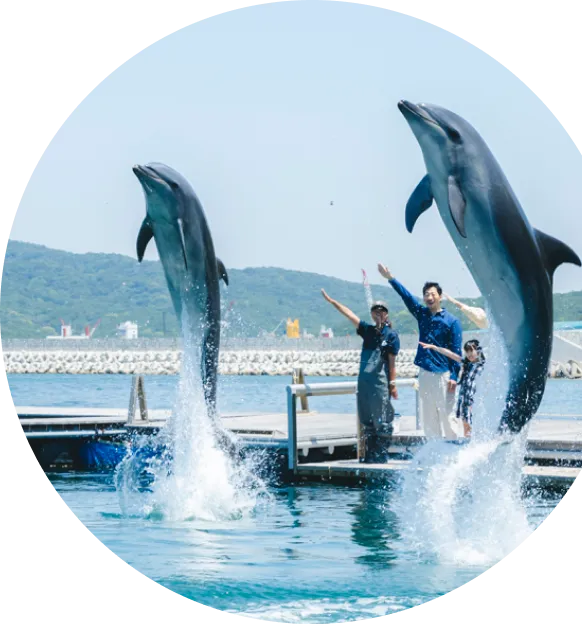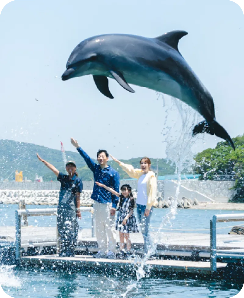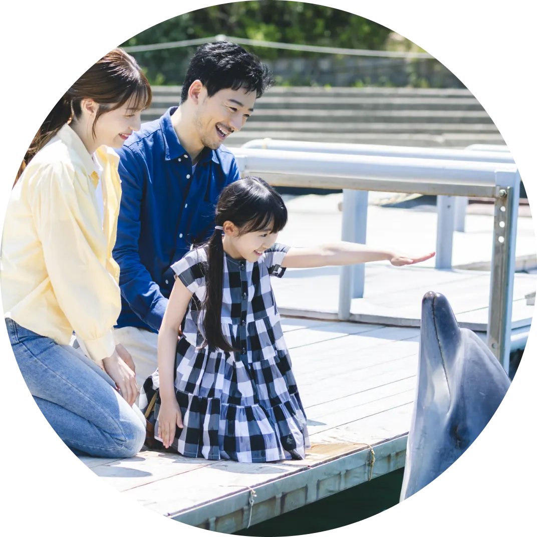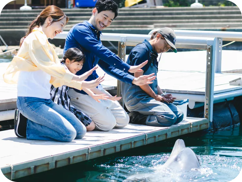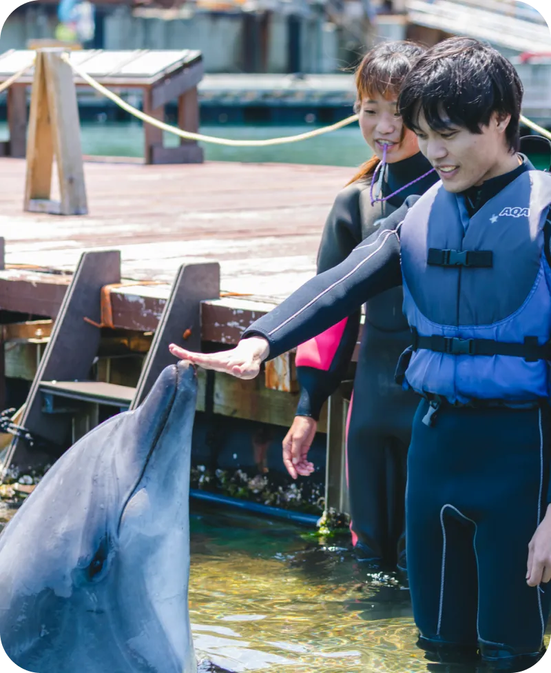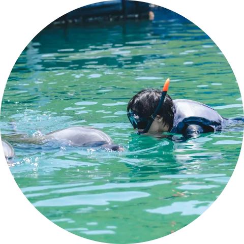 間近でイルカを見学したり、触れ合ったり、一緒に泳いだりして、イルカと仲良く楽しい時間を過ごそう!イルカのことを知り心が通い合うその瞬間は、きっと宝物に。