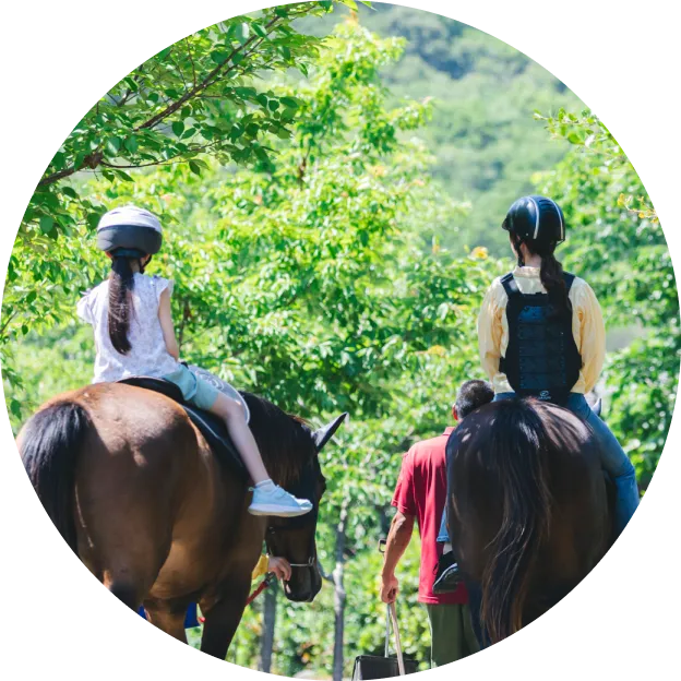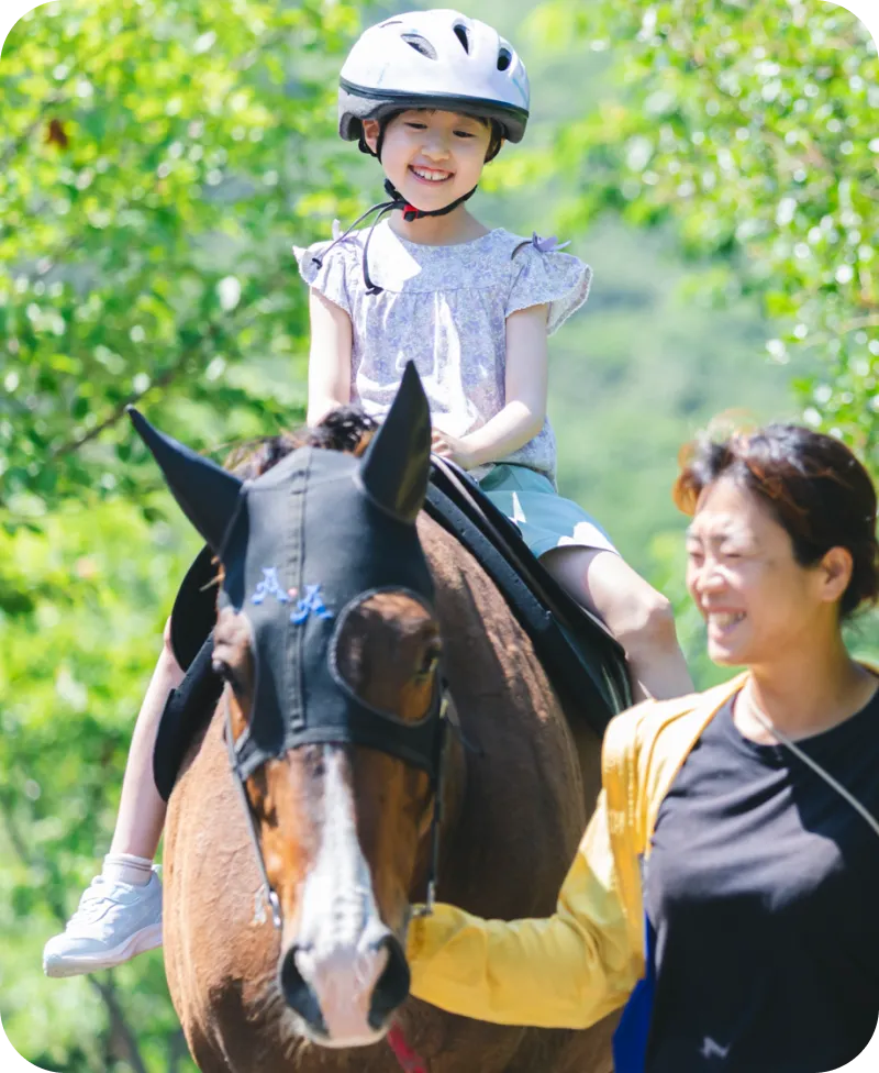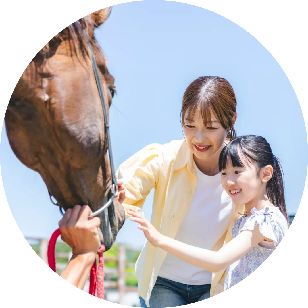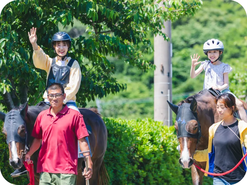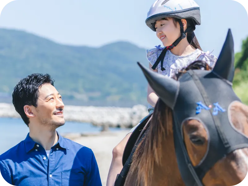 元競走馬やポニーに乗って、自然の中や海辺をのんびりお散歩。夏にはお馬さんと一緒に海に入って遊ぶコースも!個性豊かなお馬さんたちに会いに来てください。