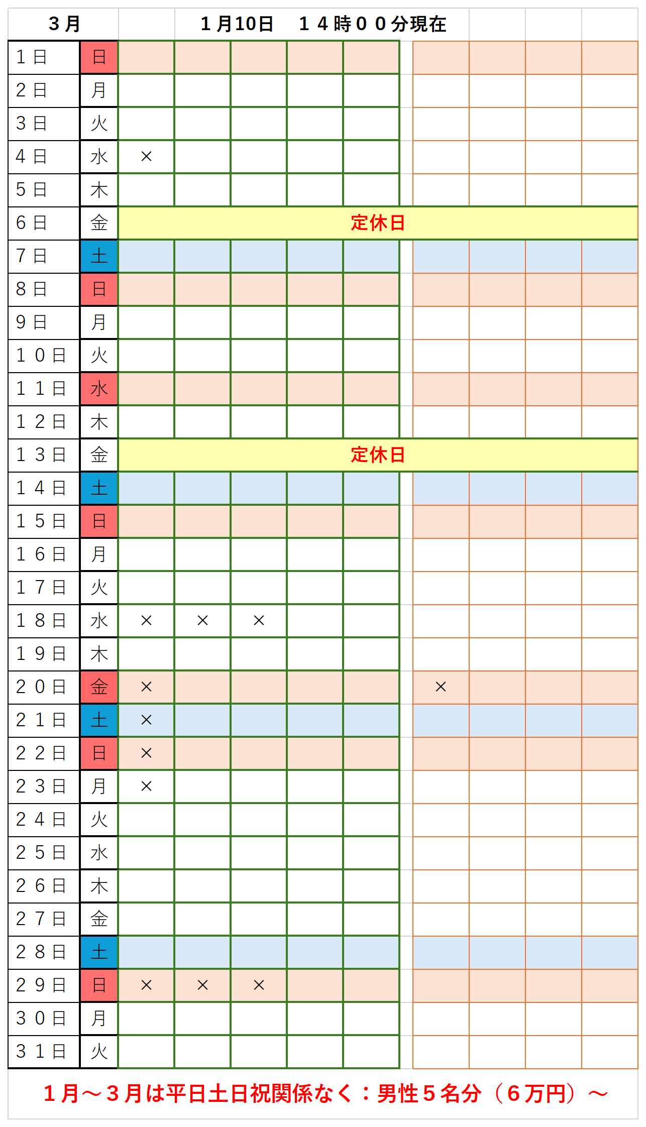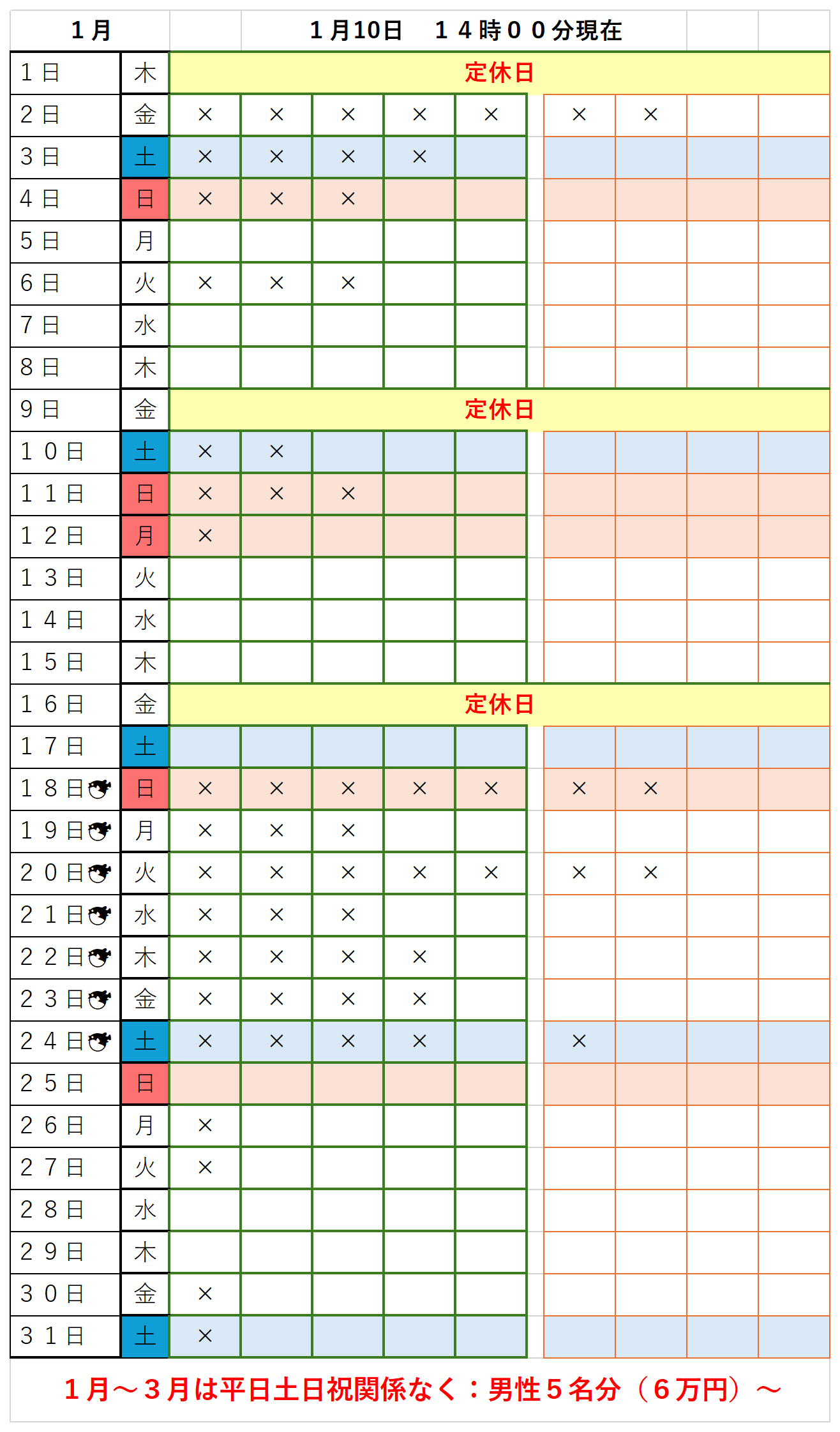 2025.12.16 フィッシング 釣堀 貸切 予約空き情報表 1月・2月・3月 *不定期更新になるかもしれませんが、宜しくお願いいたします。 ご予約時の参考にご覧ください。 ”×”は予約が入っている。 空白は”空き”予約は入っていない。 です! ニュース一覧に戻る