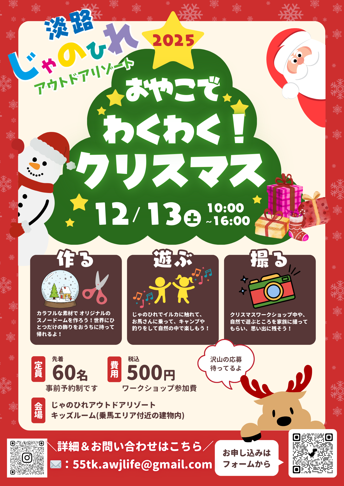 2025.11.28 イベント 2025 ☆おやこでわくわくクリスマス☆のおしらせ。 お申込みは画像の『お申込みフォームQRコード』よりお願いいたします。みなさまのふるってのご参加をお待ちしております。 ニュース一覧に戻る