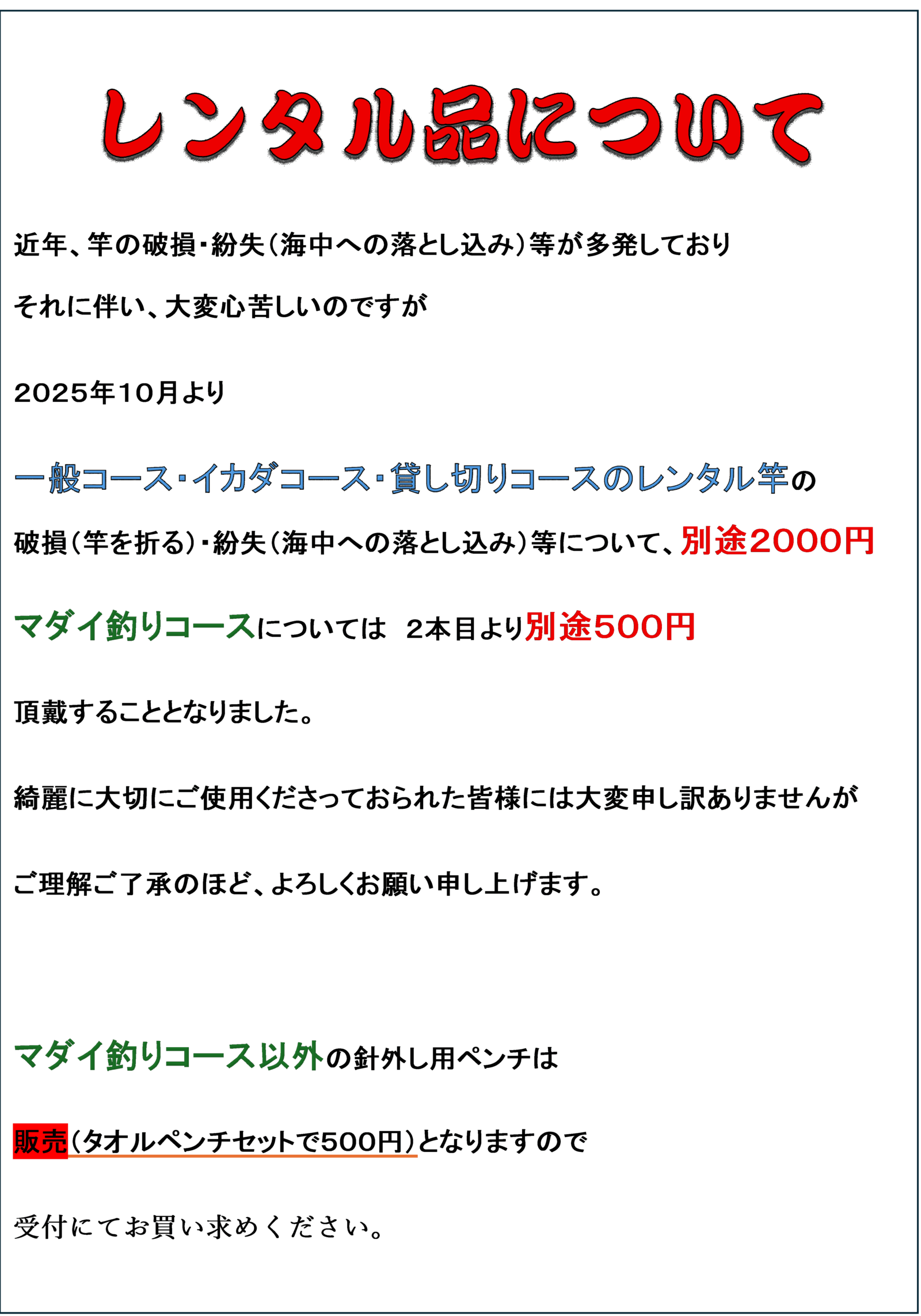 ※一般コース・イカダコース・貸し切りコースの釣り時間延長はおこなっておりません