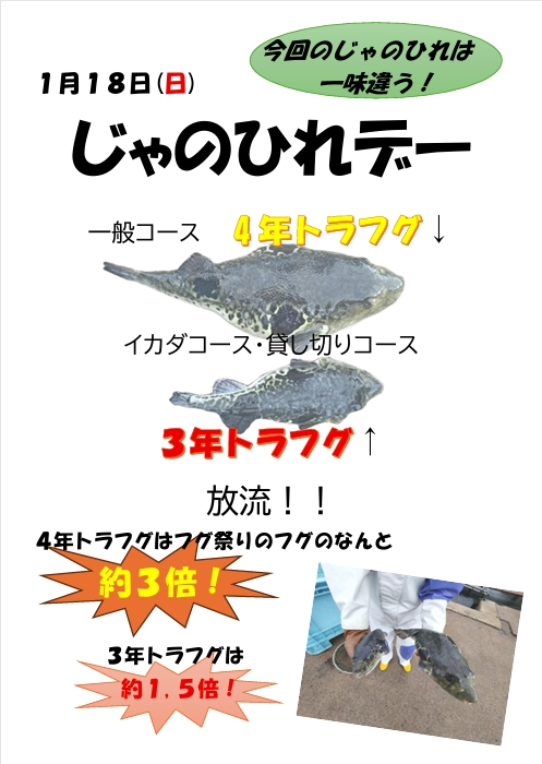 1月18日のじゃのひれデーは一般コースに4年トラフグが放流されるとか!?