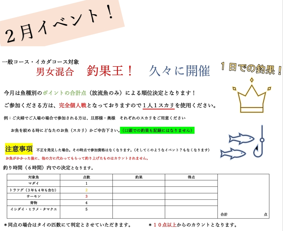 ※一般コース・イカダコース・貸し切りコースの釣り時間延長はおこなっておりません