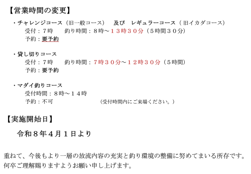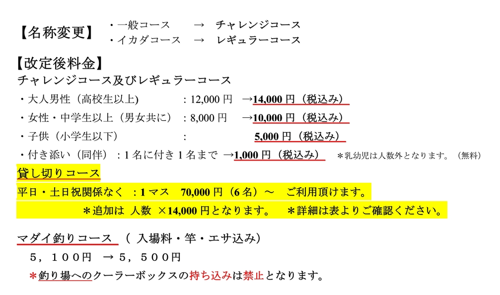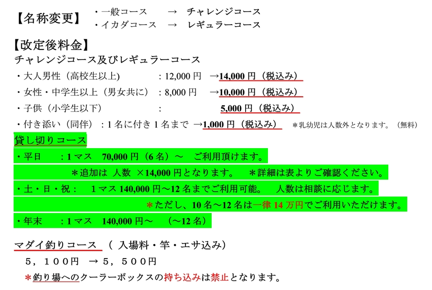 *マダイ釣りやチャレンジコース・レギュラーコースの料金は4月以前からお知らせしている内容と同じです。