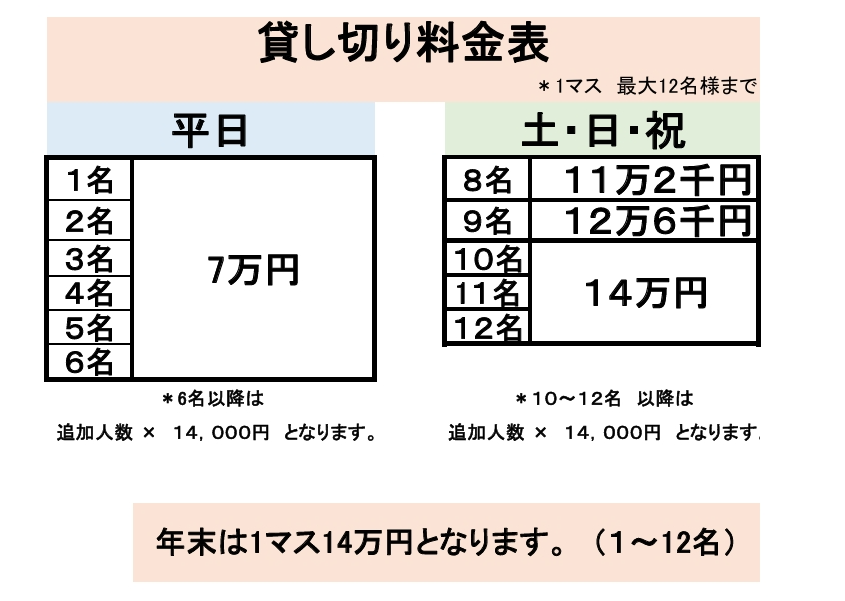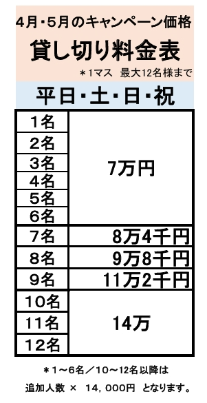貸し切りコースのみ4月・5月の料金と6月よりの料金形態が異なっております。