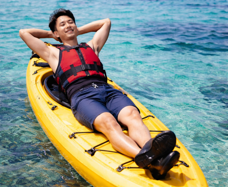 ボートに背中をつけて、仰向けにゴロン。波になったような気分を味わってみよう。