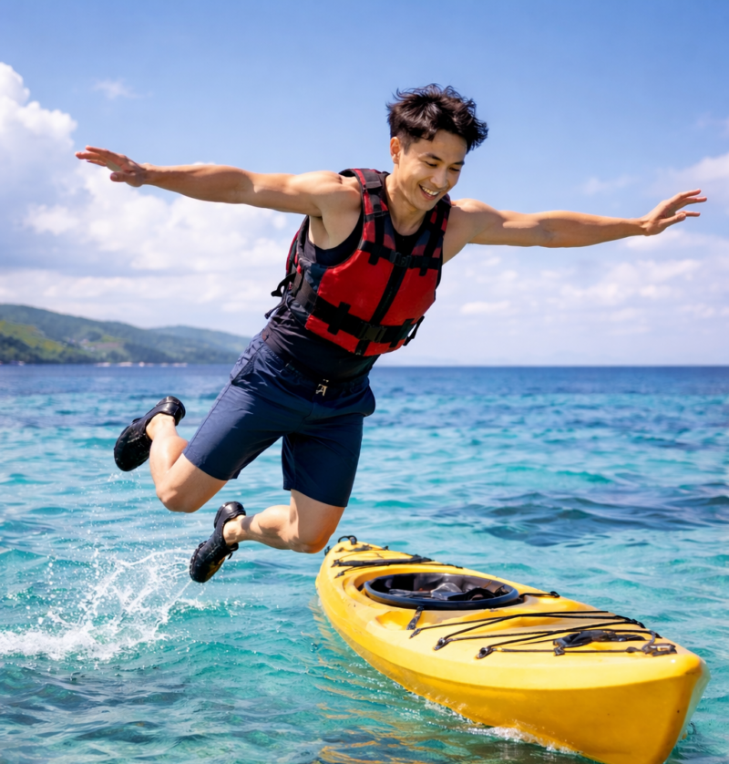 海に入りたい方、泳ぎたい方は、カヤックの上から思い切ってジャンプ!なかなかできないからこそ、爽快感満点!